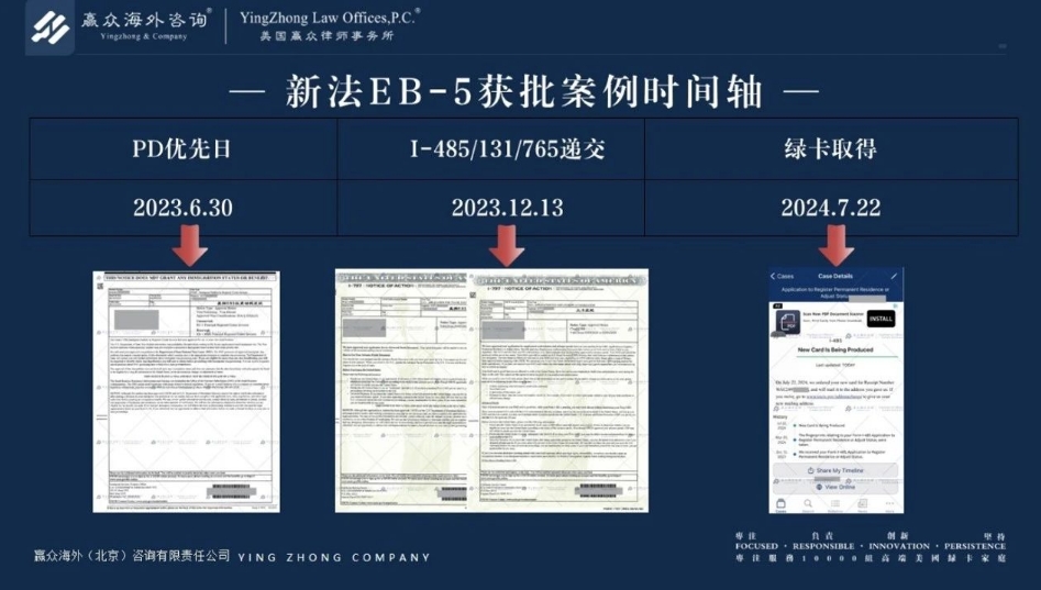 这位EB-5投资人,2023年6月30日递交了I-526E申请,12月13日递交I-485,并随同递交I-131和I-765,在2024年7月22日已经顺利取得绿卡,整个美国绿卡申请周期仅为1年1个月。