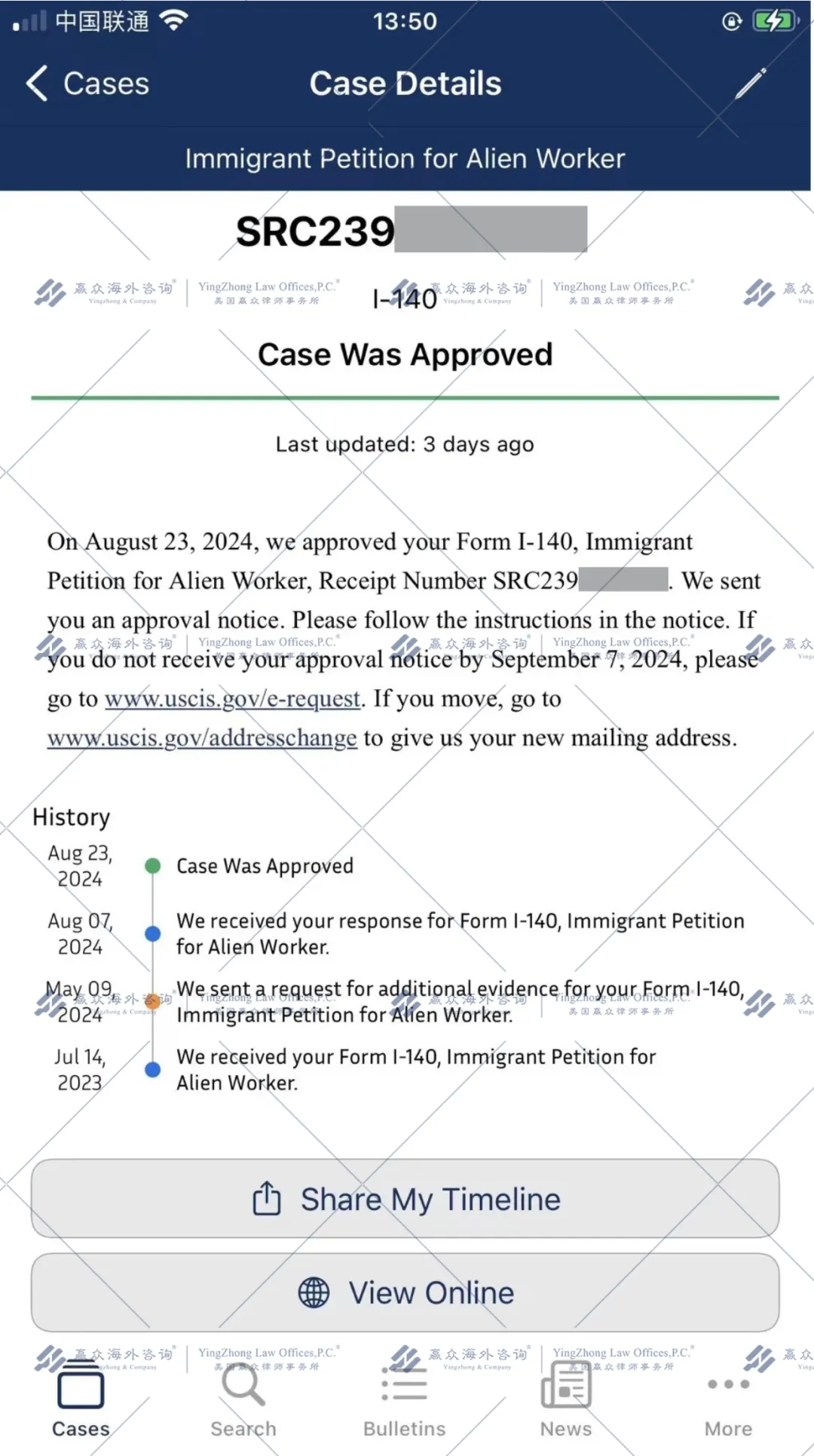 8月23日:EB1A美国杰出人才移民申请I-140补件顺利获批,审理时间为17天。