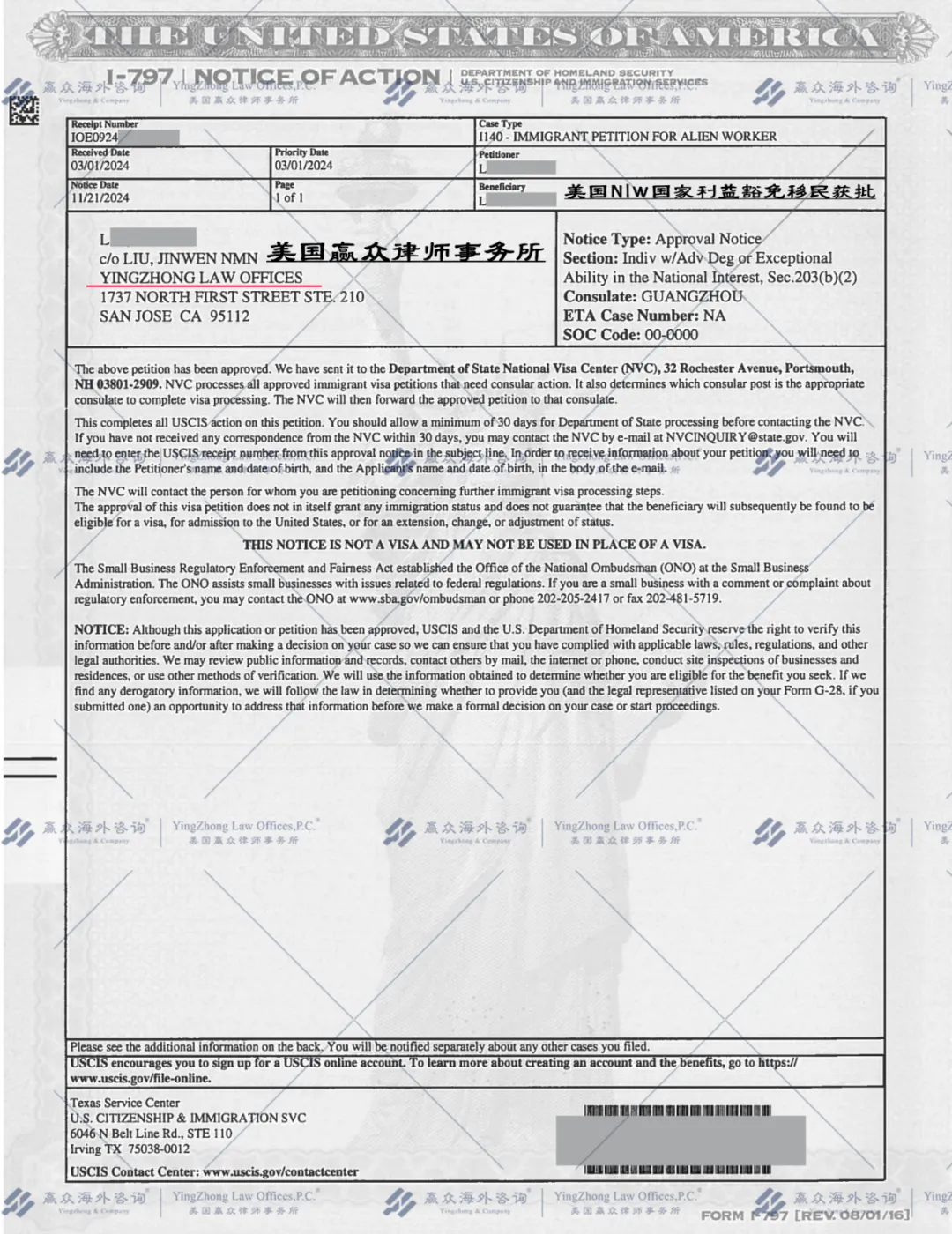 2024年11月21日,赢众海外咨询古建筑修复领域客户L先生的NIW国家利益豁免移民申请平件审理获批,现已经收到移民局官方批准函。